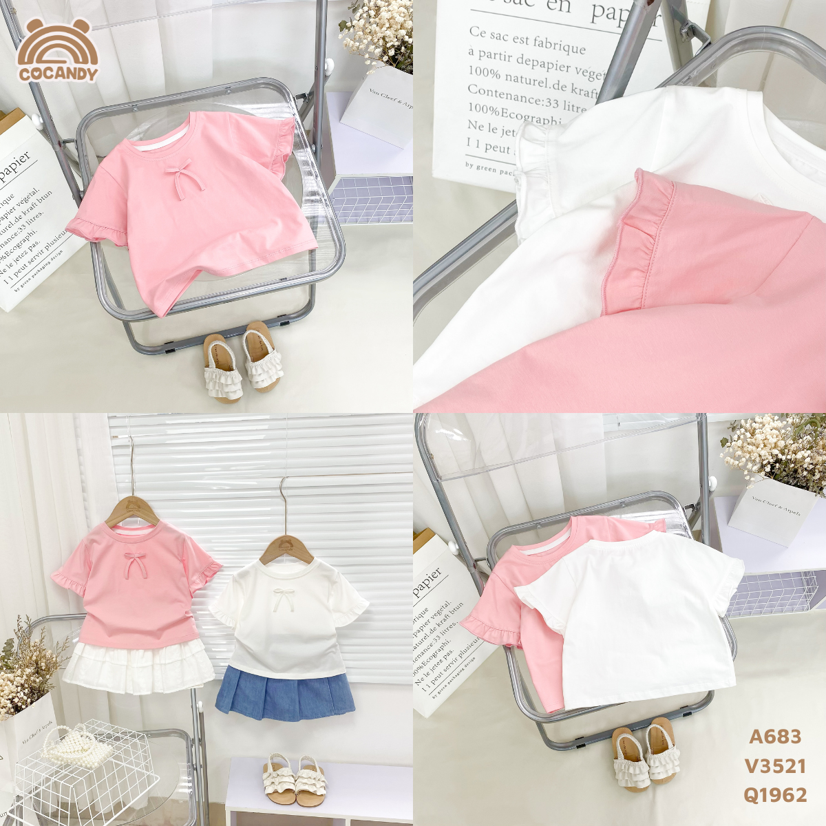 LƯU Ý: Sản phẩm chỉ gồm Áo cộc HỒNG tay bèo có nơ A683 chưa gồm các sản phẩm khác