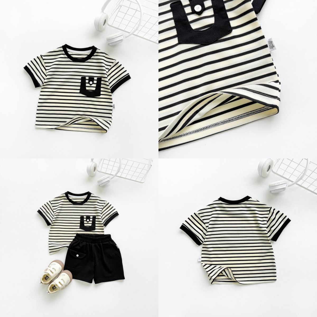 Áo cộc kẻ ĐEN BE cổ tròn túi ngực phối