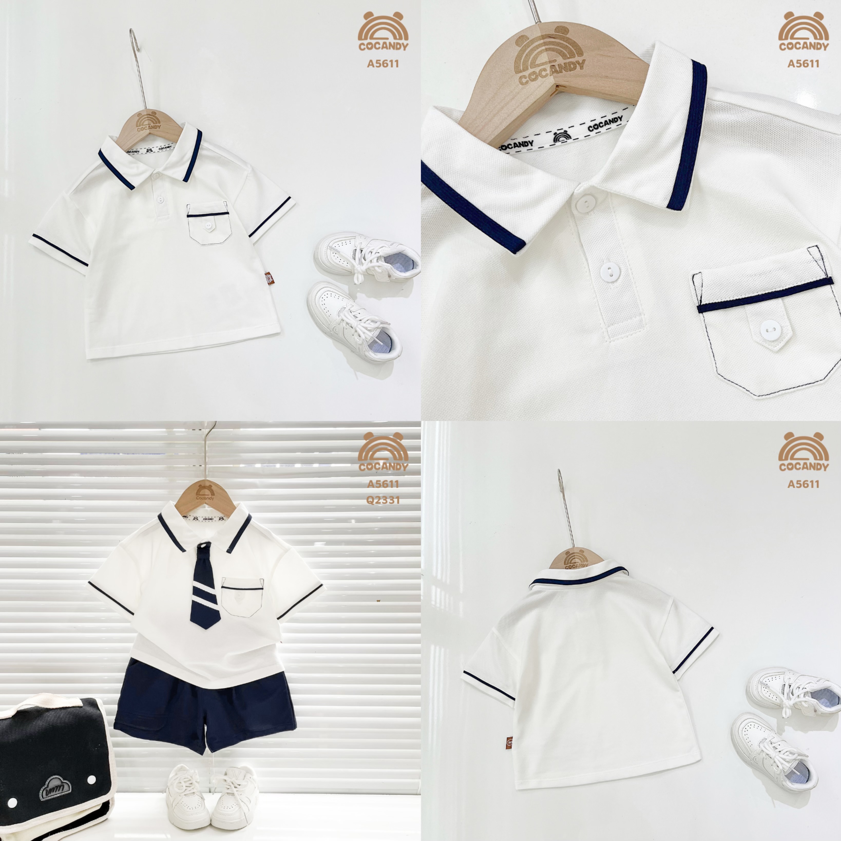 Chất liệu : - Áo cộc TRẮNG phối XTHAN túi ngực A5611 với chất liệu thun cá sấu CVC cao cấp, cấu tạo vải nhiều lỗ thoáng khí giúp bé mặc vận động thoải mái. Màu trắng kết hơp xanh than sang trọng và lịch sự