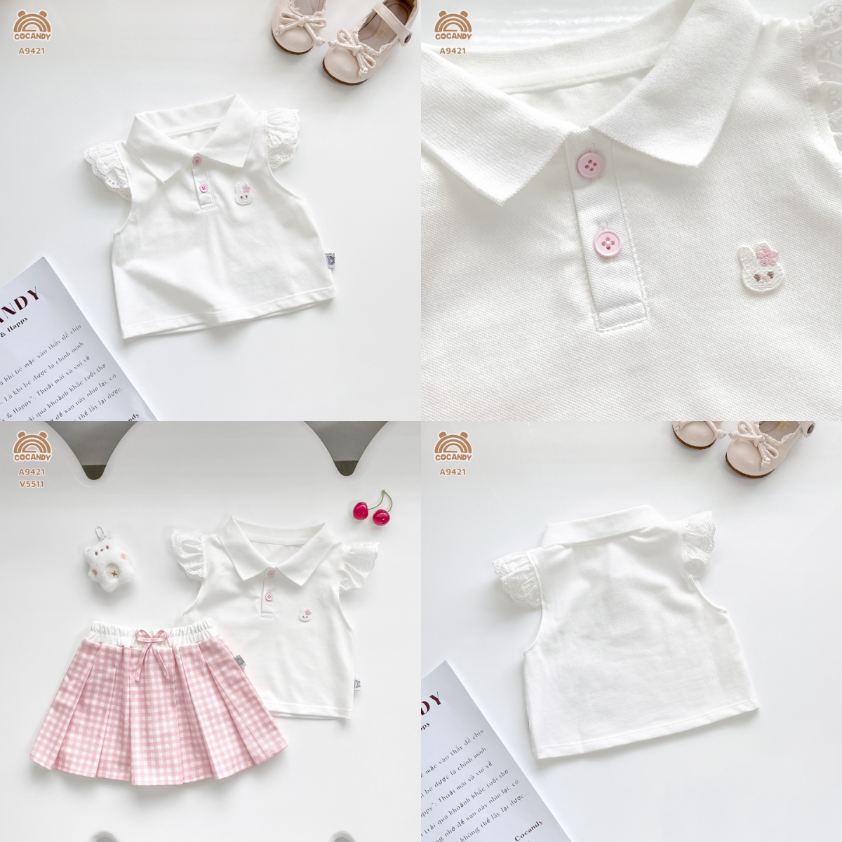 Áo cộc polo TRẮNG tay cánh tiên ren thêu thỏ