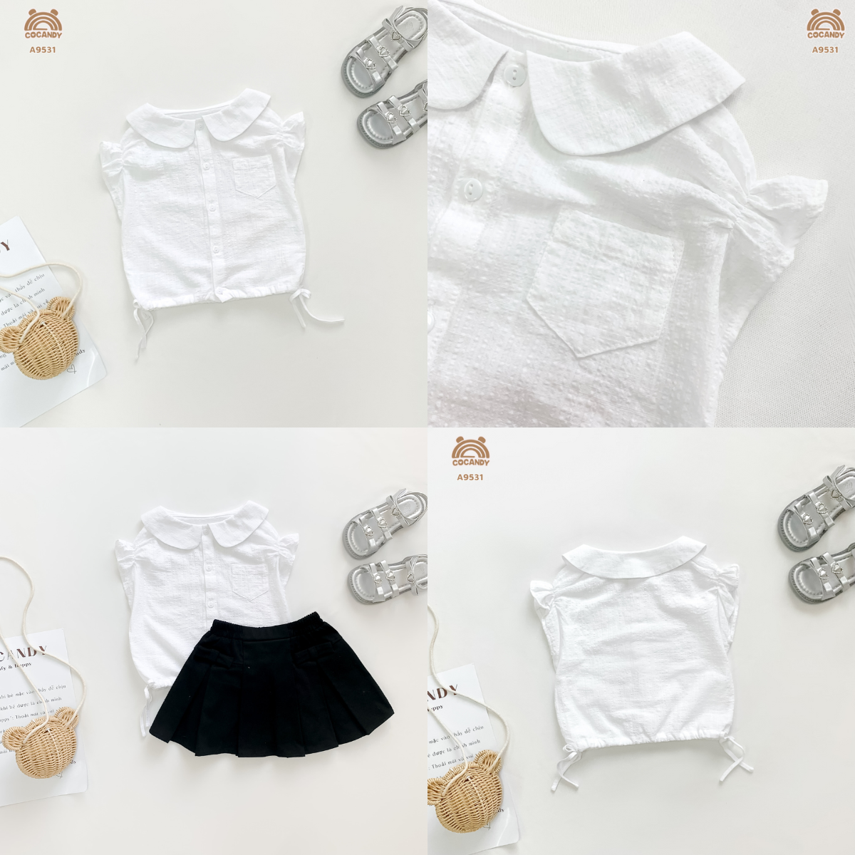 Chất liệu - Áo cộc TRẮNG cánh tiên cổ sen A9531 từ chất vải thô xốp mềm nhẹ, thoáng mát và thấm hút tốt. Cổ bẻ tròn dễ thương, điểm nhấn hai bên sườn áo có dây rút ôm nhẹ. Phom áo suông, dễ kết hợp với chân váy, quần short