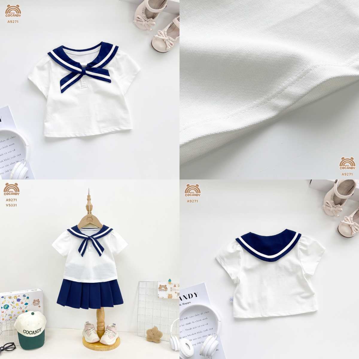 LƯU Ý: Sản phẩm chỉ gồm Áo cộc TRẮNG cổ thủy thủ xanh than sọc A9271 chưa gồm chân váy