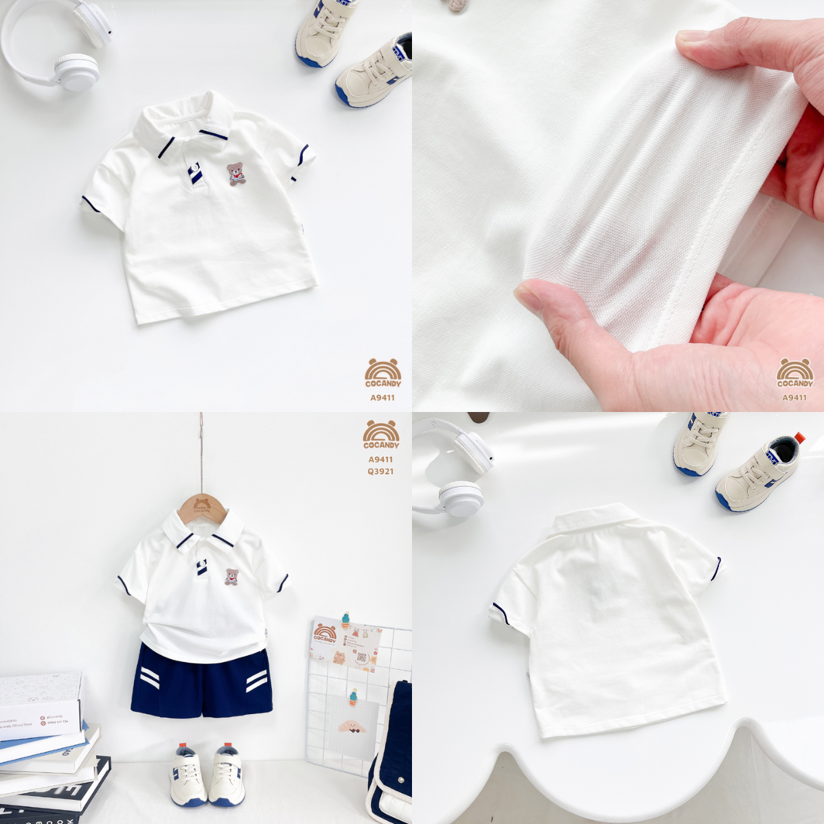 LƯU Ý: Sản phẩm chỉ gồm Áo cộc TRẮNG polo viền cổ xanh than thêu gấu A9411 chưa gồm quần