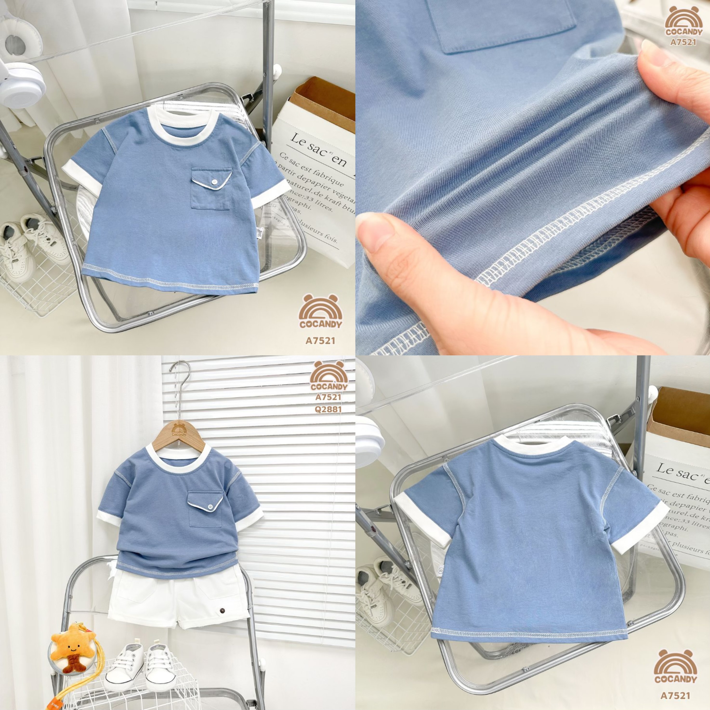 Chất liệu : Áo cộc XANH GHI phối viền TRẮNG túi ngực có nắp A7521 chất liệu cotton co giãn nhẹ, kết cấu vải thấm hút mồ hôi và mát mẻ, thích hợp các bé ưa vận động