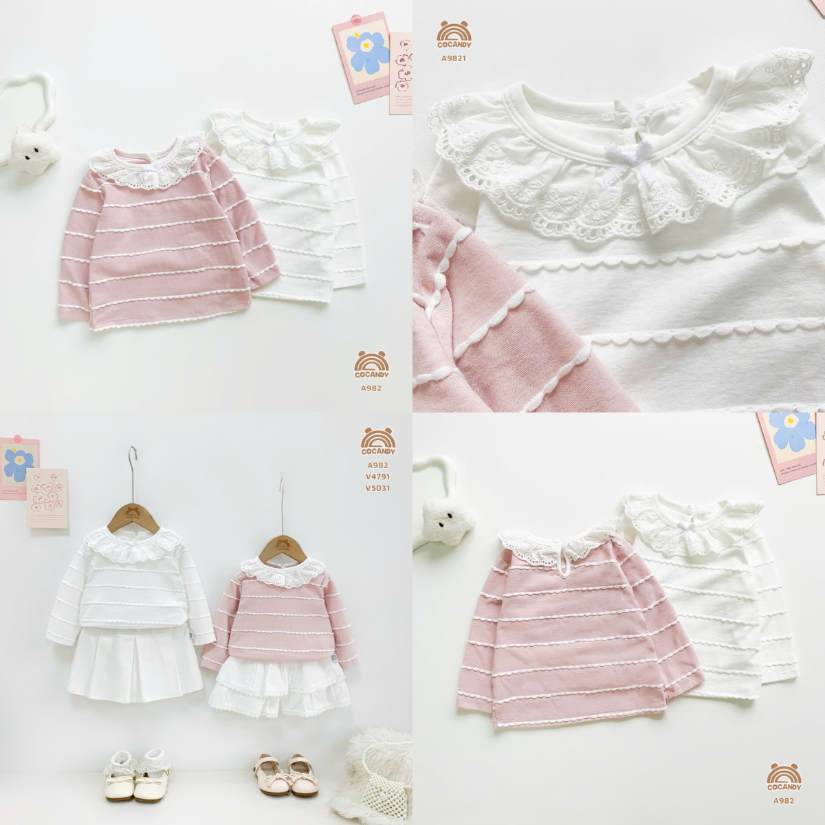 Chất liệu :- ÁO dài sóng nhún bèo cổ A982 chất liệu cotton mềm mịn, nhẹ nhàng, thấm hút tốt, vải thêu chỉ sóng điệu. Thiết kế cổ bèo ren thêu hoa, dễ phối cùng các mẫu chân váy, quần và yếm...