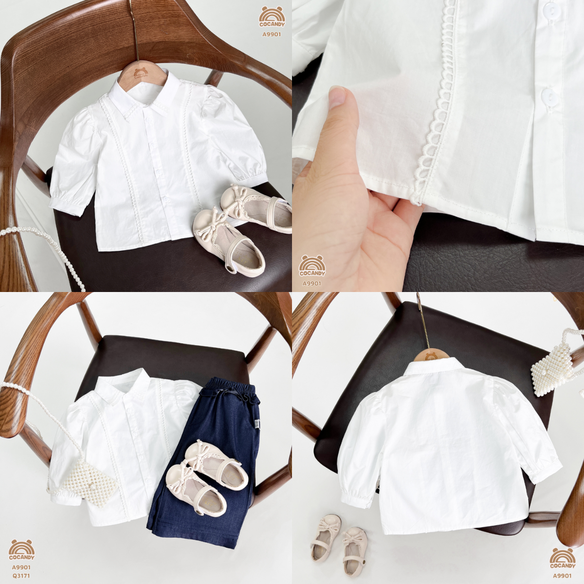 Chất liệu :-- ÁO dài TRẮNG sơ mi tay phồng A9901 chất liệu thô cotton trơn, thiết kế cổ bẻ truyền thống điểm nhấn các đường phối ren dọc thân áo và cổ tinh tế. Kết cấu vải thoáng mát cho bé mặc đi học đi chơi phối cùng quần, yếm hoặc chân váy đều đẹp