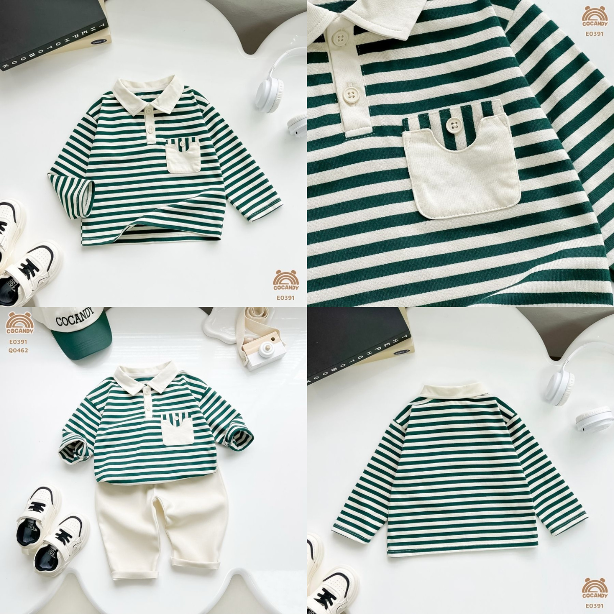 Chất liệu - Áo dài XANH kẻ BE cổ bẻ phối túi ngực E0391 chất cottton 100% mềm và ấm. Cổ áo polo phối màu be cùng tổng màu kẻ và túi ngực tạo điểm nhấn, màu sắc tươi mới dễ mix đồ cho bé đi học đi chơi