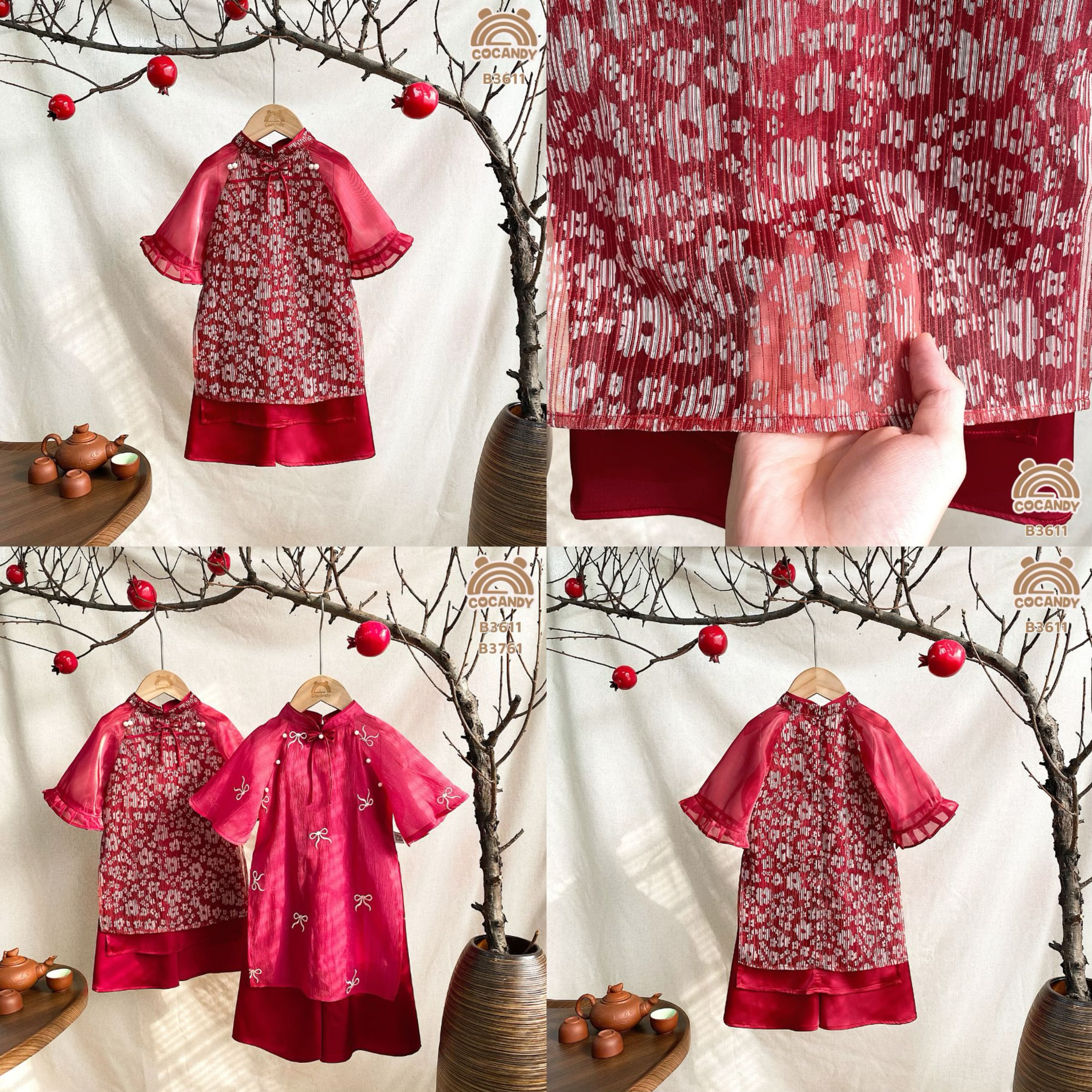 Chất liệu :- Bộ áo dài ĐỎ Quỳnh Hoa B3611 thiết kế ren nền kim tuyến nhẹ dập nổi hoạ tiết hoa đào, bên trong lót lớp lụa cao cấp mềm mại phối hợp cùng quần lụa mềm mại. Thiết kế cách tân kết hợp hiện đại, cổ tròn cách điệu, đi kèm dây thắt nơ nhỏ ở cổ tạo điểm nhấn duyên dáng. Tay áo lửng kết hợp đường bèo nhún mềm mại, tăng vẻ nữ tính và sang trọng.