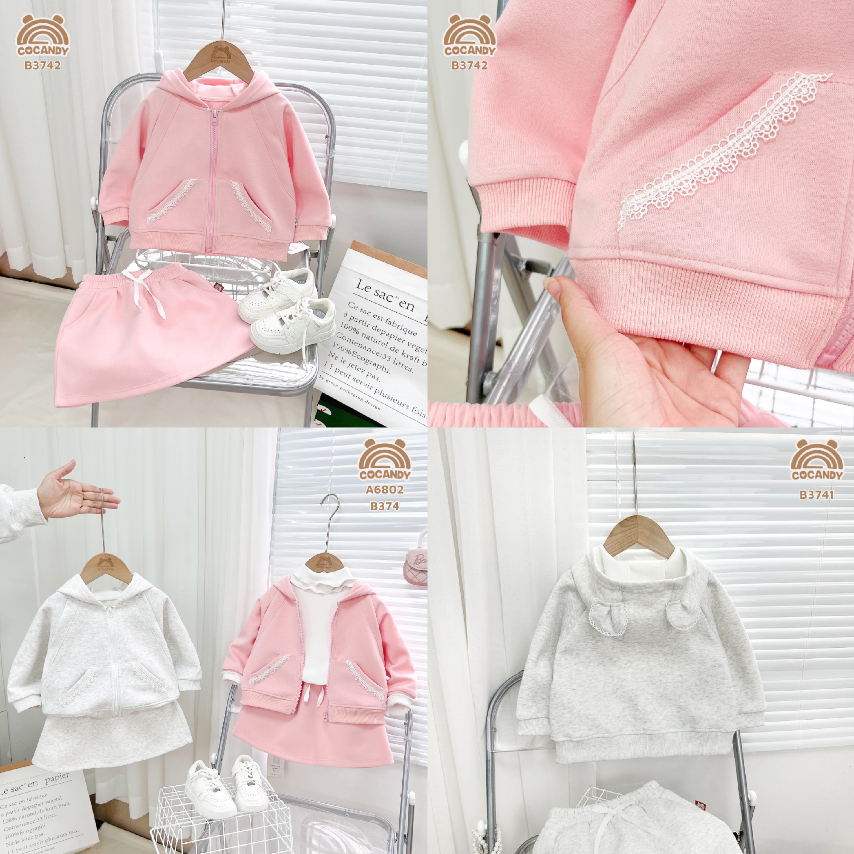 LƯU Ý: Sản phẩm chỉ gồm Bộ áo váy XÁM SÁNG túi viền ren tai gấu chưa gồm các sản phẩm khác