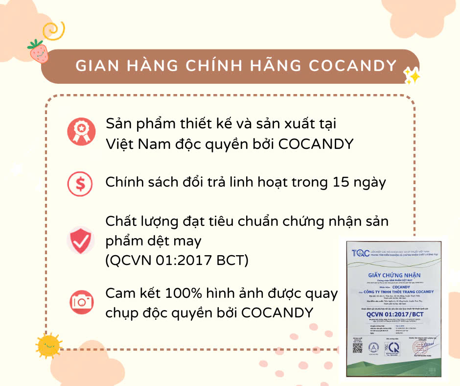 - Sản phẩm được thiết kế và sản xuất tại Việt Nam bởi công ty TNHH thời trang COCANDY
