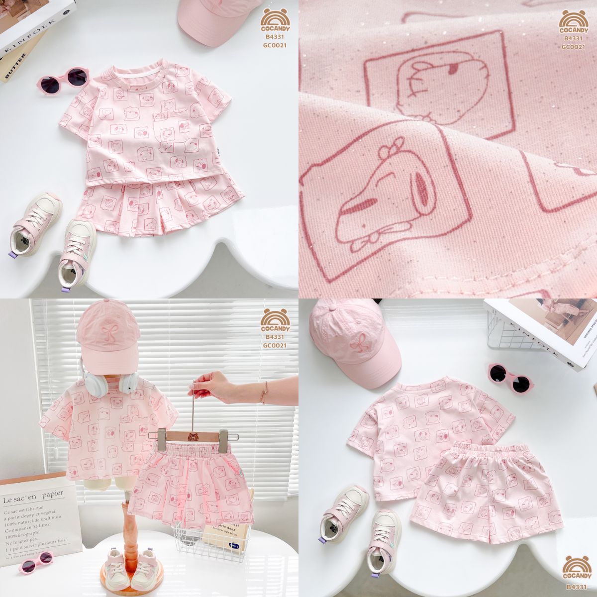 Chất liệu : - Bộ cộc HỒNG họa tiết mặt cún B4331 với chất cotton mềm và thấm hút, bề mặt hoạ tiết xinh xắn với gam màu tươi sáng. Chất liệu điểm kim tuyến CAO CẤP nhẹ trên nền vải trông bling bling đảm báo bé nào cũng mê mà mặc lên vẫn mềm mại thoải mái.
