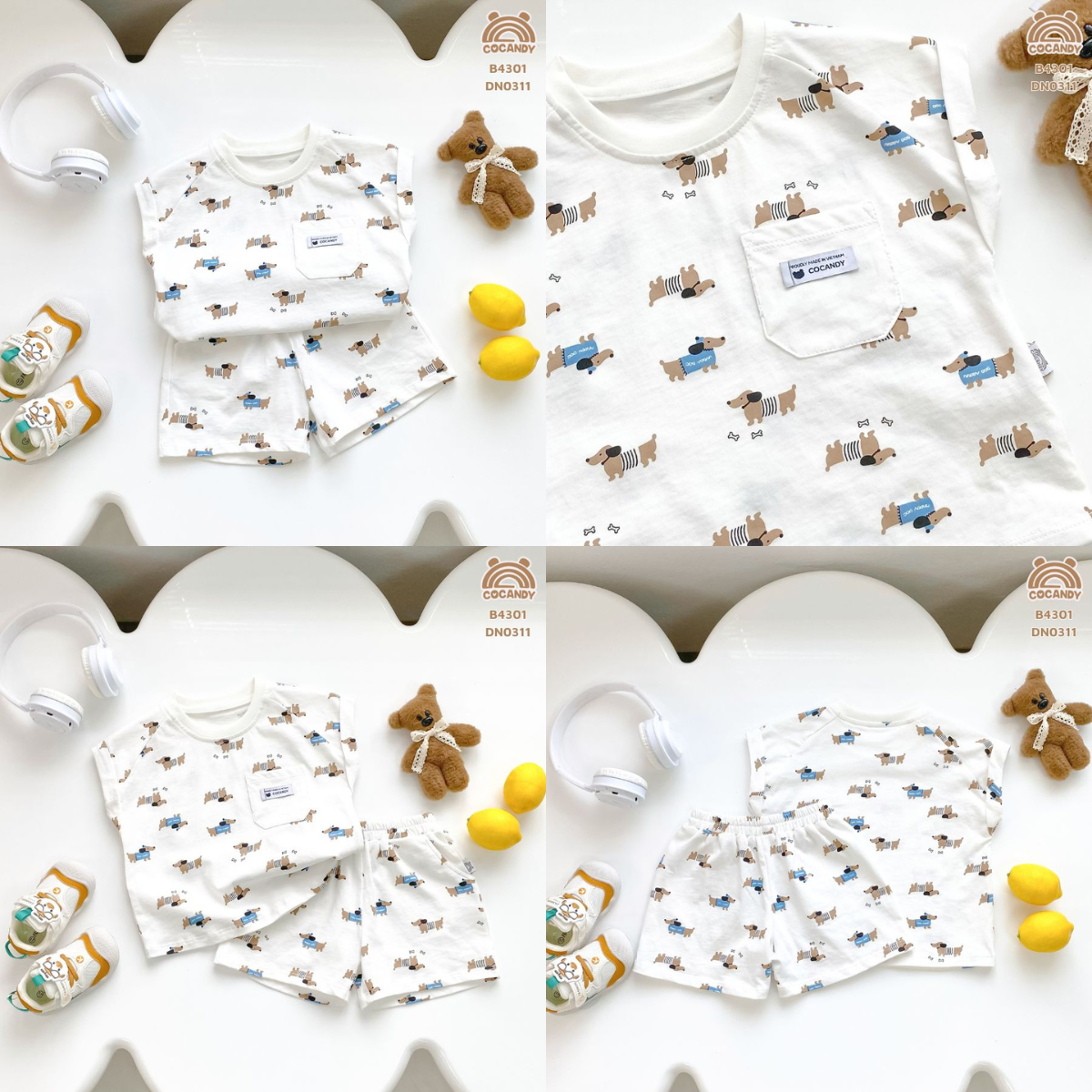 Chất liệu : - Bộ cộc TRẮNG B4301 chất liệu cotton cao cấp với độ mềm mại và thấm hút cao. Thiết kế xinh xắn, in công nghệ cao với họa tiết hình cún Dachshund đáng yêu bé nào cũng thích
