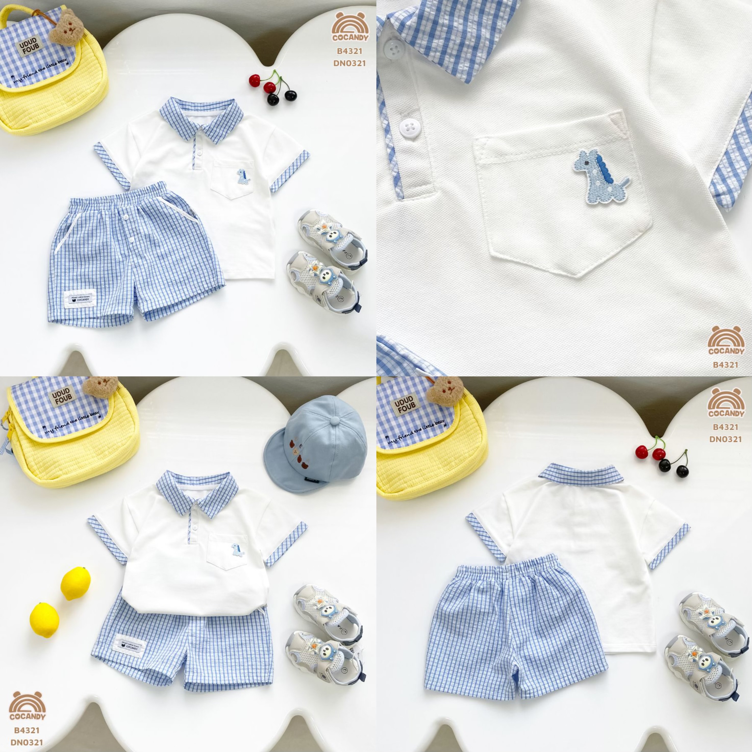 -Bộ cộc TRẮNG phối caro XANH cổ bẻ đính hươu B4321 với áo chất thun cá sấu CVC kết hợp cùng quần chất thô Hàn mát mẻ. Set đồ cực xinh với áo polo trắng phối cổ và tay caro xanh pastel, điểm nhấn là hình thêu nhỏ xinh ở túi ngực. Quần short caro đồng bộ giúp tổng thể hài hòa, năng động thích hợp cho bé mặc đi học, đi chơi hay dạo phố