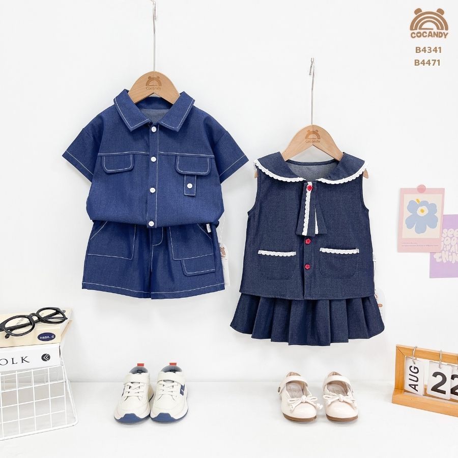 Chất liệu - Bộ cộc XANH cúc đỏ + chân váy xếp ly B4471 chất liệu thô Hàn màu jean. Thiết kế sát nách, cổ thủy thủ viền ren trắng xinh xắn. Chân váy xếp ly dễ mặc, bên trong có lớp lót quần bé thoải mái vận động