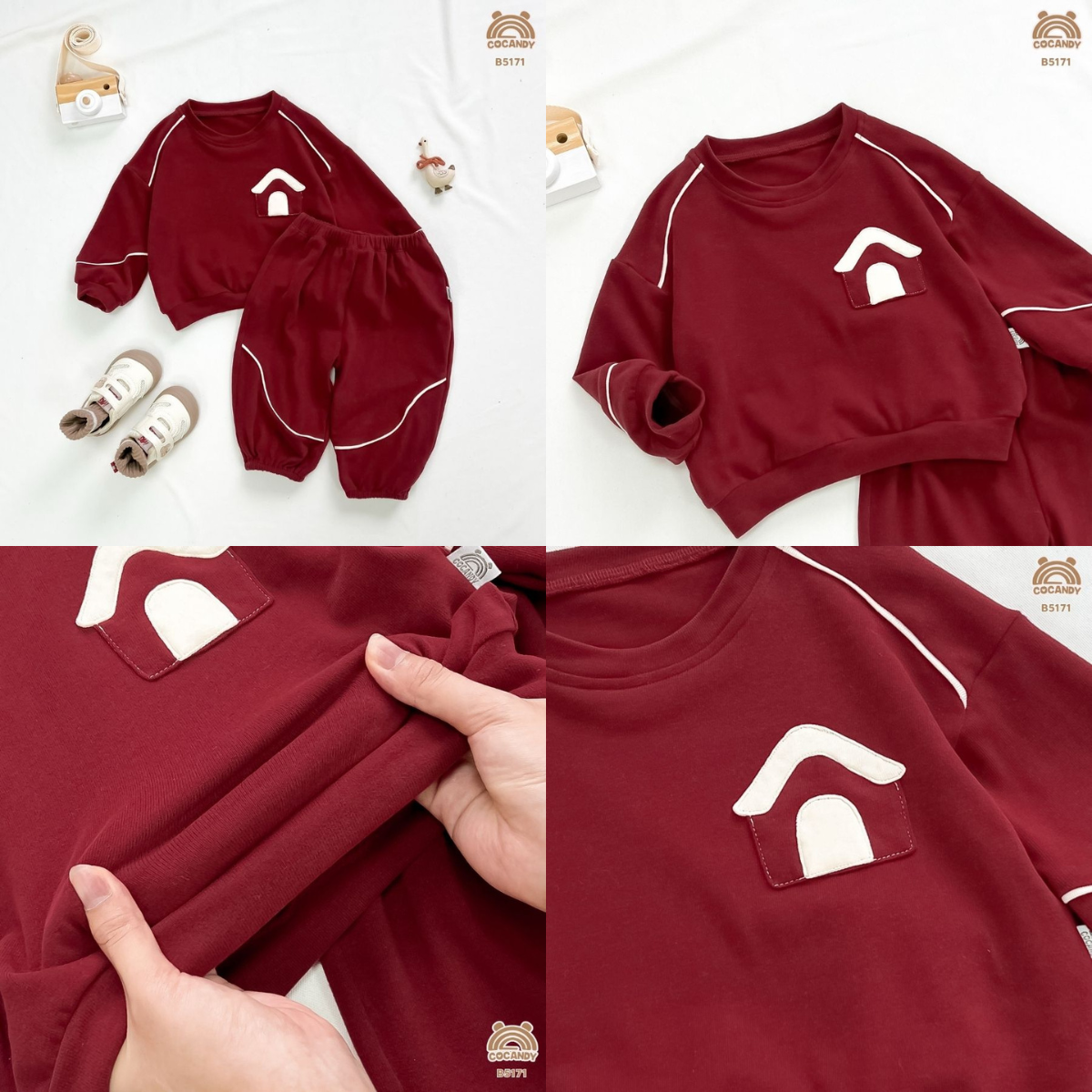 Chất liệu - Bộ dài ĐỎ cổ tròn phối BE B5171 chất nỉ cotton dòng cao cấp, bề mặt vải siêu mềm mịn, dày dặn và ấm áp. Thiết kế kiểu dáng năng động, quần dài bo ống cùng lưng chun co giãn bé vận động thoải mái, giữ ấm hiệu quả.