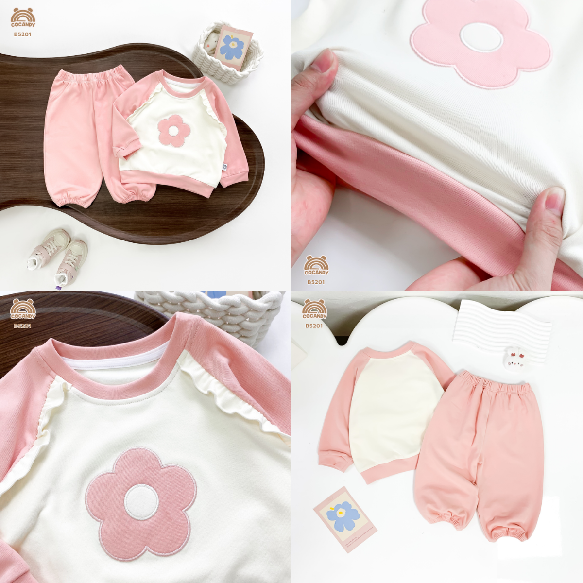 Chất liệu - Bộ dài HỒNG BE phối bèo B5201 chất nỉ cotton dòng cao cấp, bề mặt vải siêu mềm mịn, dày dặn giữ ấm cho bé trong thời tiết thu-đông. Màu sắc ngọt ngào cùng chi tiết bèo nhún điệu đà, họa tiết thêu chắc chắn. Bộ dài bo gấu cùng lưng chun co giãn tốt cho bé hoạt động thoải mái cả ngày