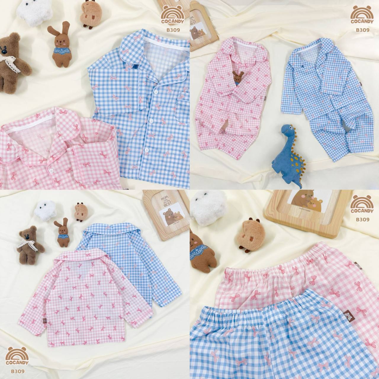 Bộ dài pijama caro XANH nơ HỒNG