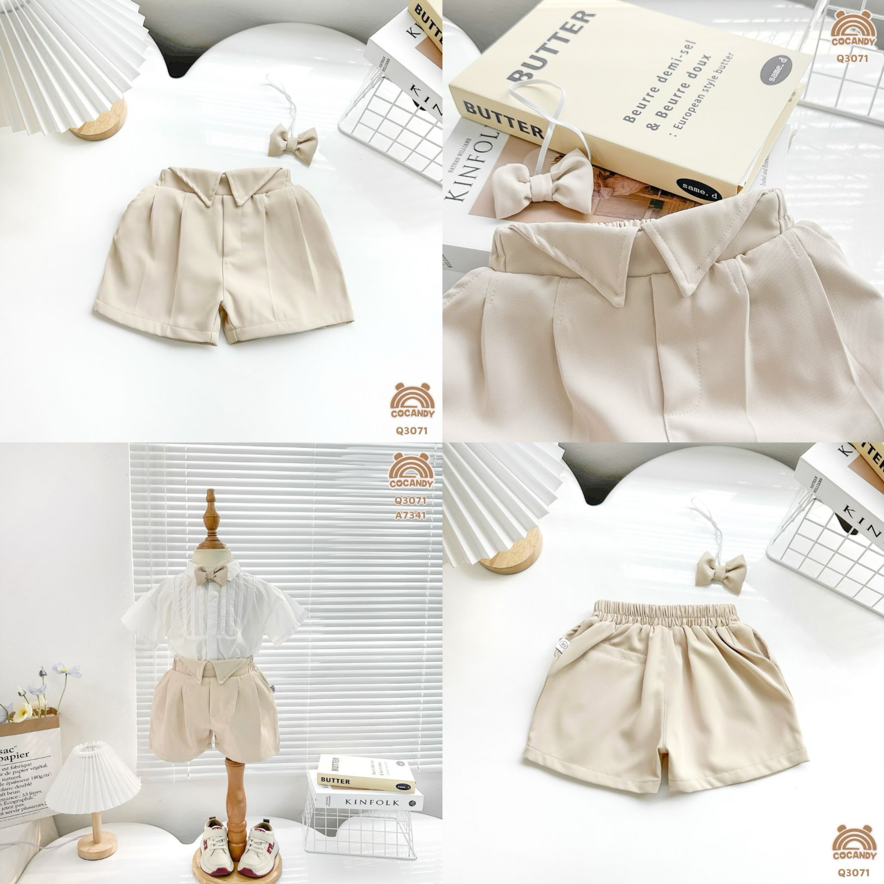 Chất liệu : - Quần cộc BE cạp vạt tam giác TẶNG kèm nơ cổ Q3071 chất xước Nhật cao cấp ít nhăn, đặc biệt mềm và mát, thân thiện với làn da. Thiết kế điểm nhấn cạp quần lạ mát kèm nơ để bé mix và phối đồ dễ dàng