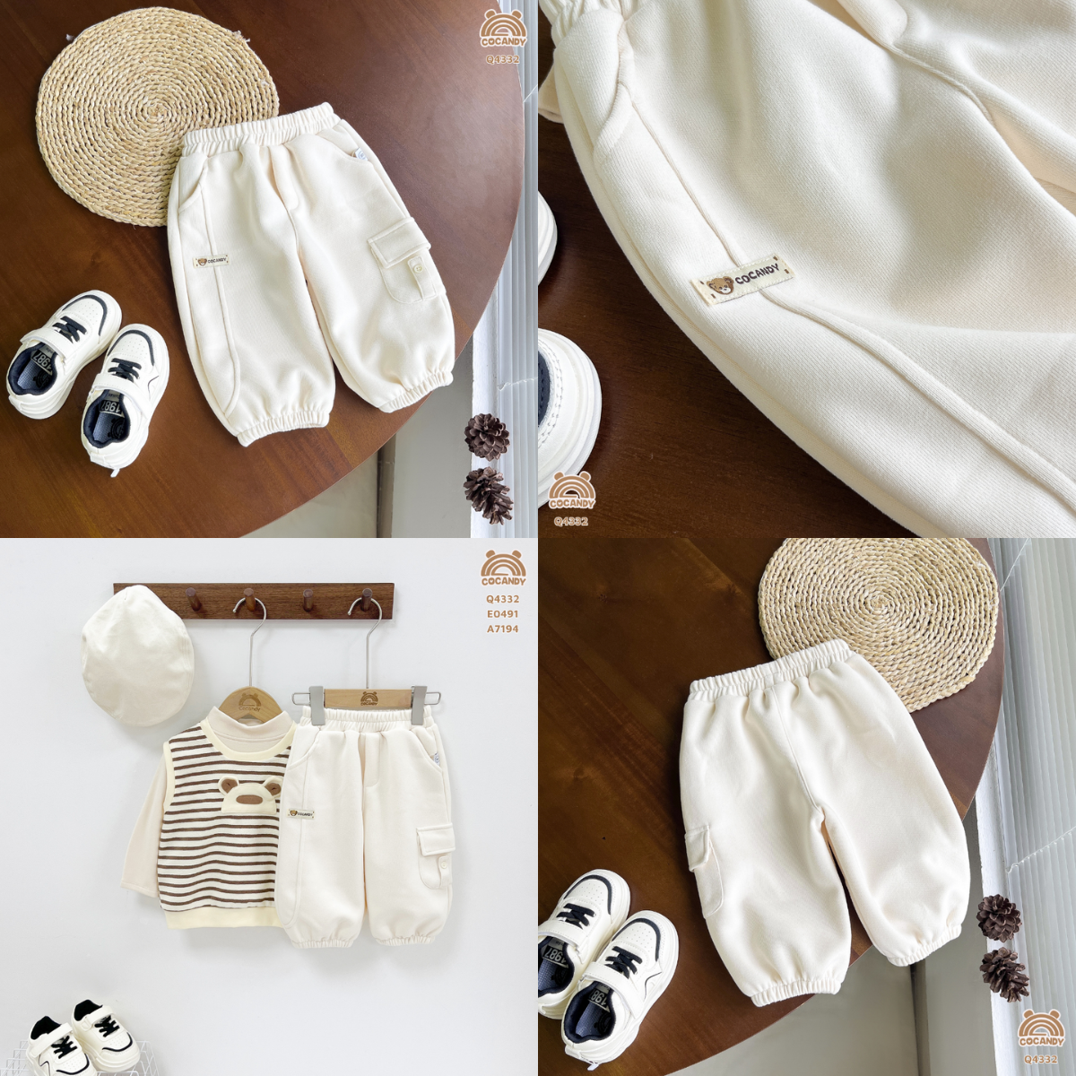 Chất liệu - Quần dài BE phối 1 túi ốp sườn COCANDY Q4332 chất nỉ 2 da mềm dày dặn giữ ấm tốt. Form dáng bom gấu năng động cho bé mặc thoải mái và tiện dụng.