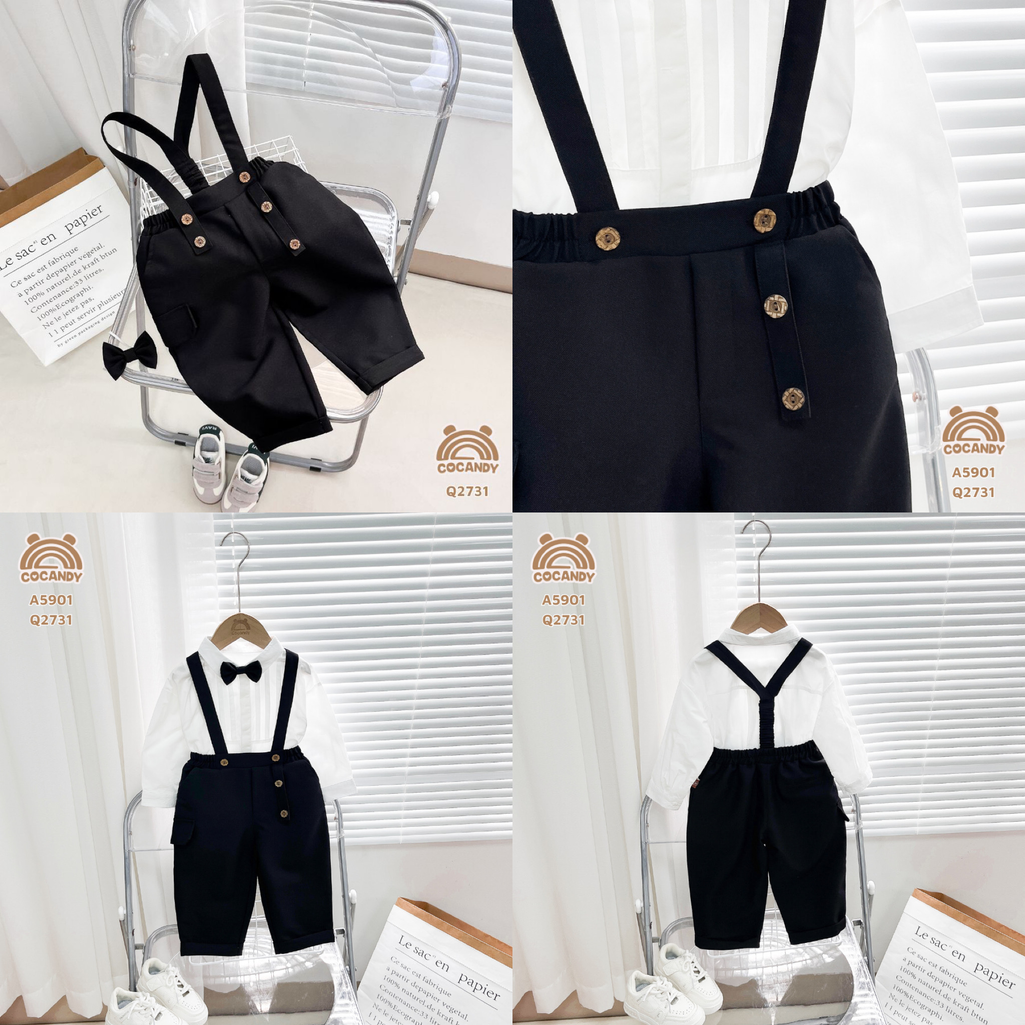 Chất liệu : Quần dài ĐEN phối 2 quai dây kèm nơ Q2731 chất xước trơn Nhật cao cấp ít nhăn và mềm mại. Thiết kế kiểu công tử xinh xắn phối cúc gỗ lạ mắt.