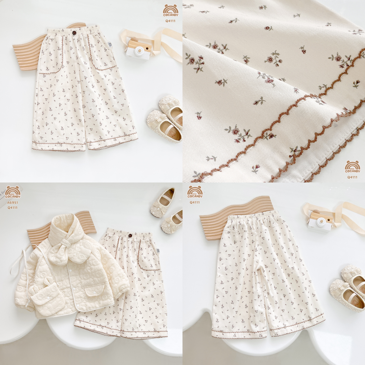Chất liệu - Quần dài suông BE hoa nhí bèo gấu Q4101 chất kaki mềm mại, sợi vải dệt thoáng khí và chắc chắn. Màu sắc và form xuông nhã nhặn đáng yêu và dễ phối đồ vô cùng ạ