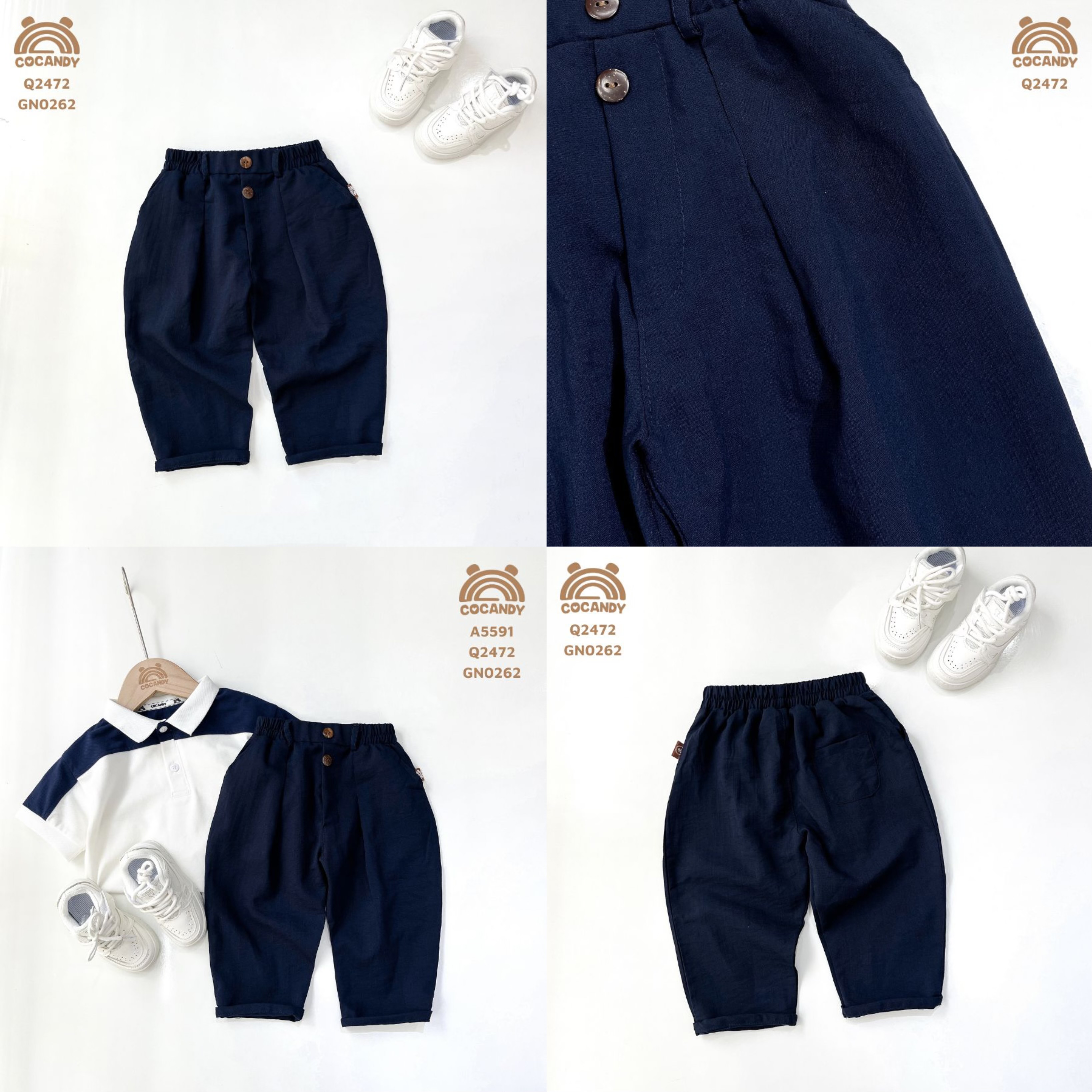 Chất liệu :Quần dài XANH THAN phối 2 cúc Q2472 chất liệu xước Thái mềm mại, ít nhăn, thoáng mát cho làn da bé