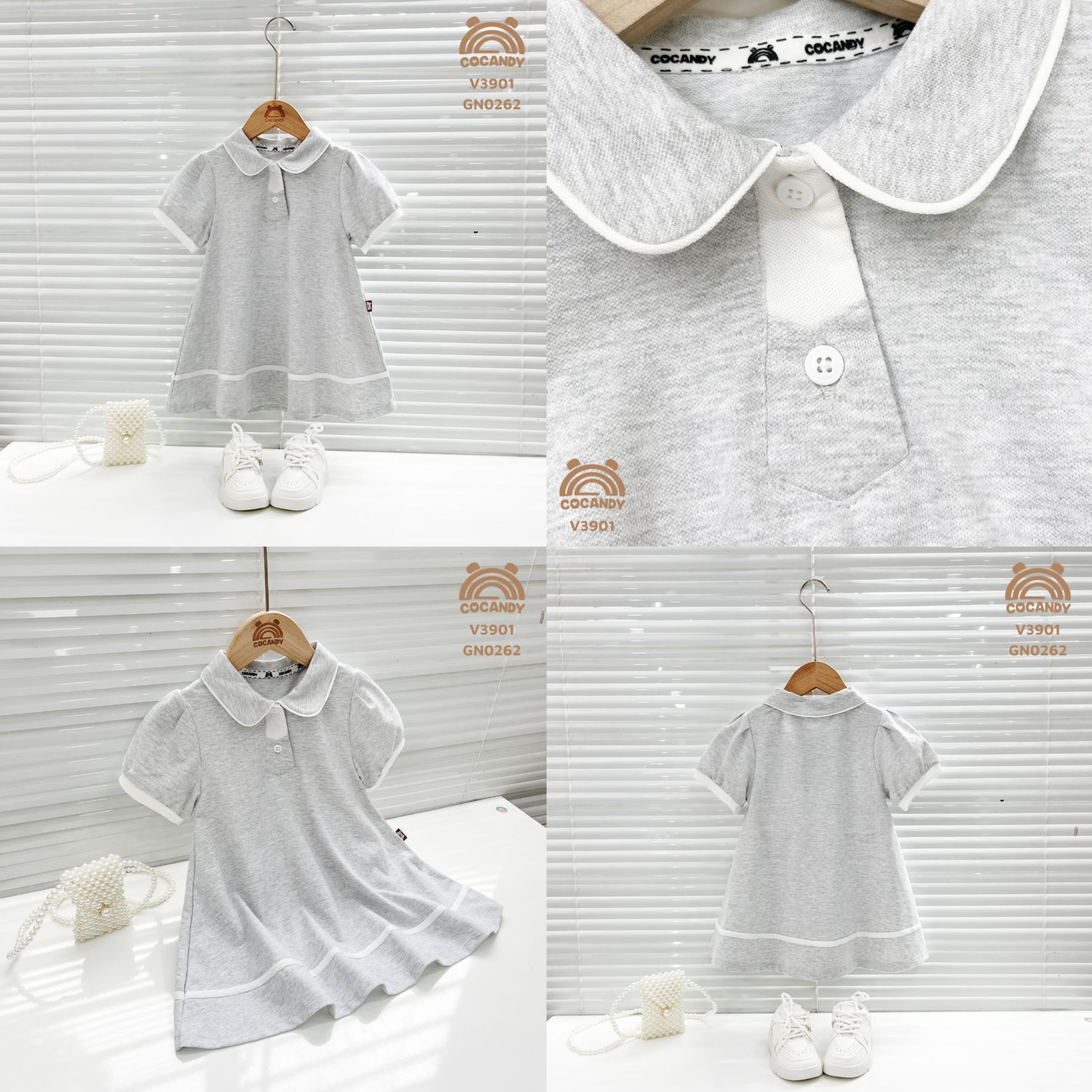 Chất liệu :- Váy cộc GHI phối TRẮNG có cổ V3901 từ chất liệu thun cá sấu CVC cao cấp co giãn nhẹ, dáng váy chữ A thoải mái. Thiết kế kế có cổ lịch sự năng động bé mặc đi học đi chơi đều xinh