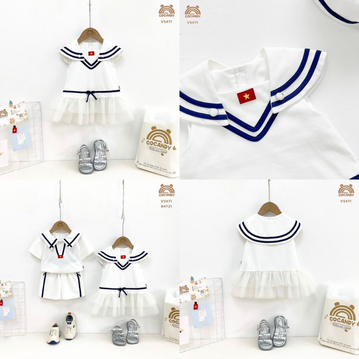 Chất liệu :- Váy cộc TRẮNG thủy thủ phối voan lưới V5471 chất liệu thun cá sấu CVC cao cấp. Thiết kế cổ thủy thủ đính nút xinh xắn, điểm nhấn cờ đỏ sao vàng trước ngực tạo hình ảnh "nữ chiến sĩ nhỏ" dễ thương. Chất co giãn thoải mái, chân váy tầng lưới bồng nhẹ, tạo độ xòe tự nhiên. Nơ nhỏ trước eo tăng phần nữ tính. Thích hợp mặc đi học, sự kiện trường, lễ kỷ niệm hoặc chụp hình. Dễ phối sandal hoặc giày búp bê