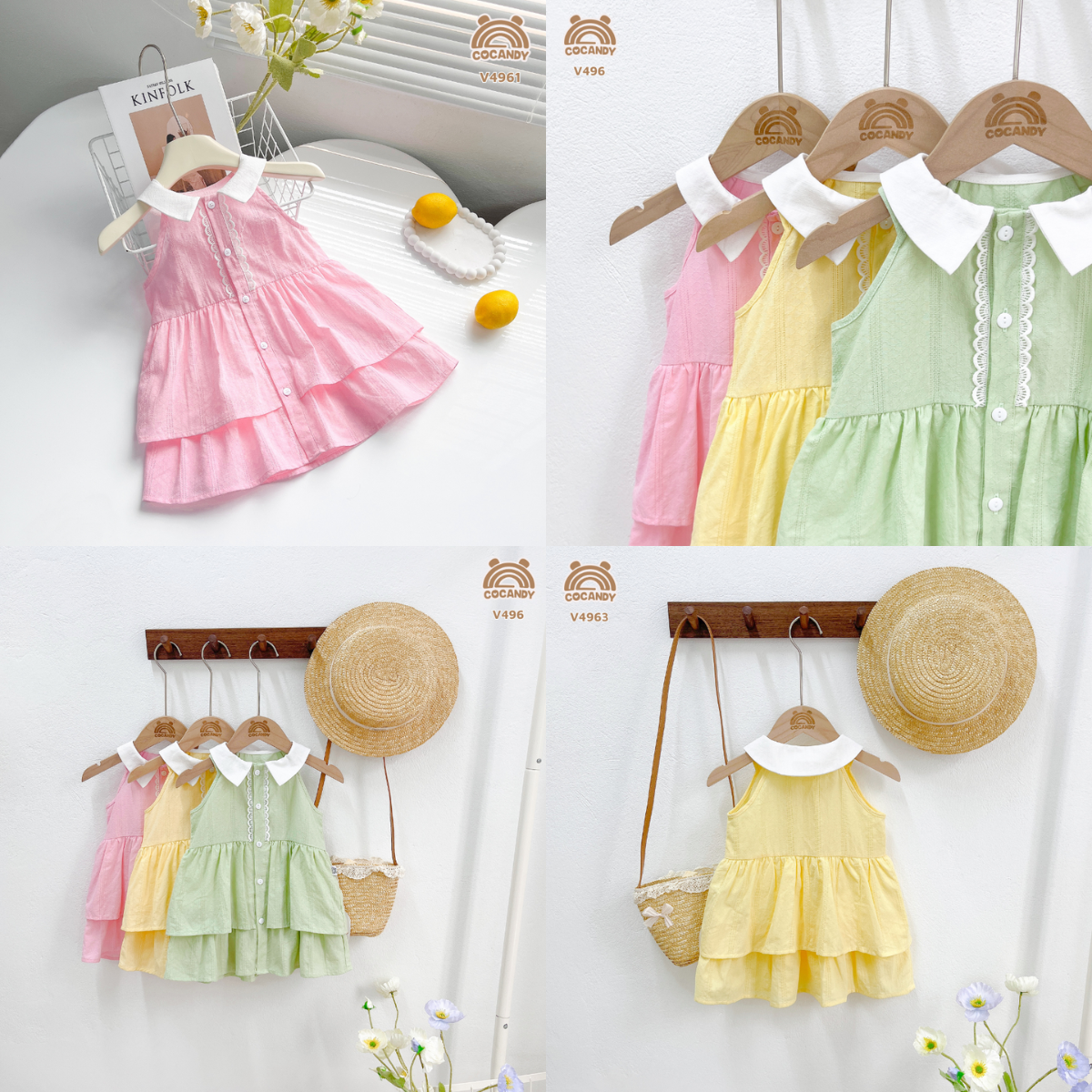 Chất liệu :- Váy cộc VÀNG, HỒNG, XANH sát nách cổ bẻ 2 tầng V496 chất thô boi chỉ nổi độc đáo với các lỗ thông hơi đảm báo thoáng mát và mềm mại. Váy thiết kế tầng điệu đà xinh xắn, ở phần thân mông váy bên em có may thêm lớp lót để bé diện thoải mái và tiện lợi ạ