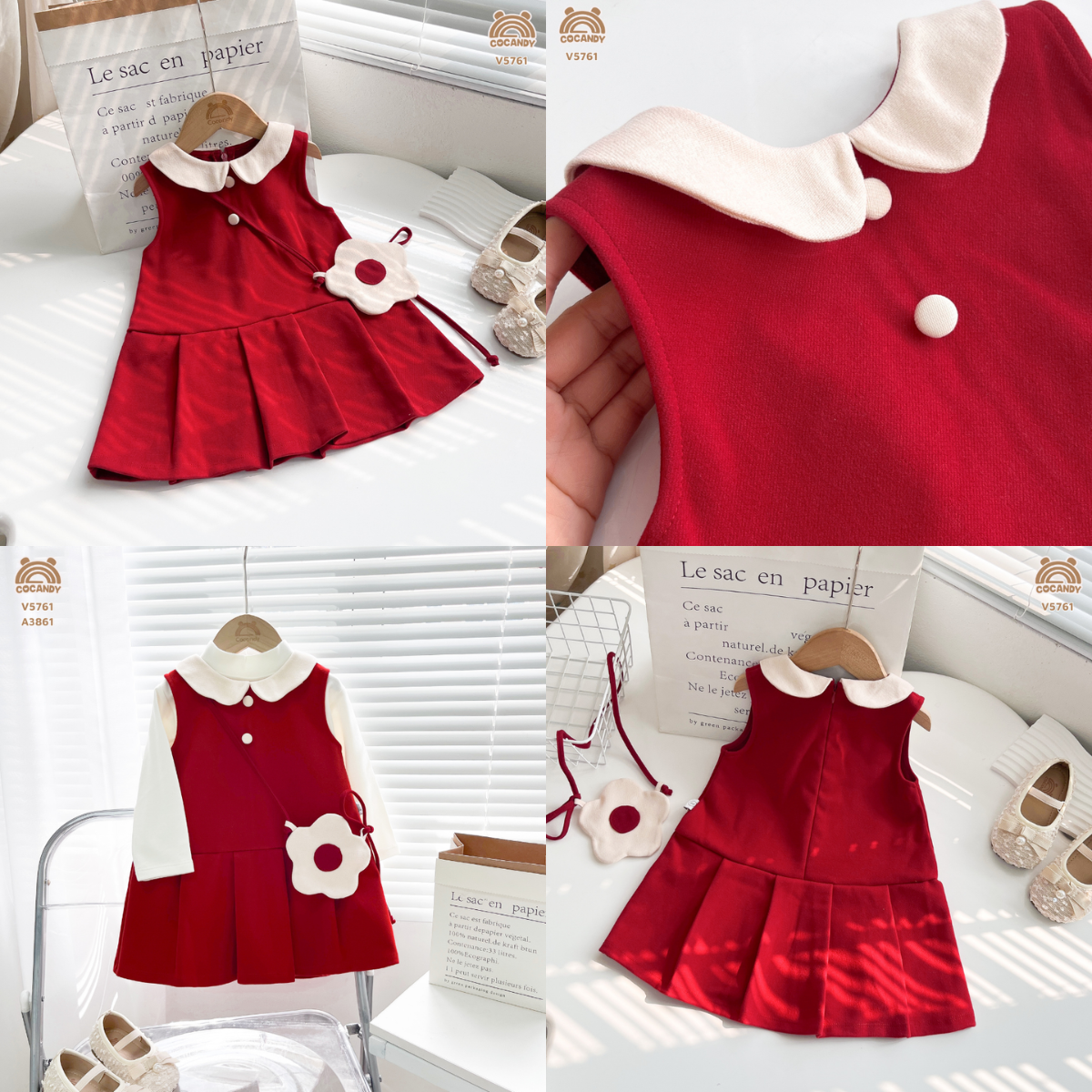 Chất liệu :- VÁY dạ ĐỎ sát nách TẶNG kèm túi hoa V5761 chất liệu dạ dày dặn, lên form xinh xắn. Dáng váy xếp ly tạo cảm giác năng động, đáng yêu. Bé mặc đi học đi chơi đều tiện dụng, phù hợp tiết mát trời hoặc se lạnh